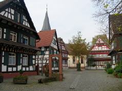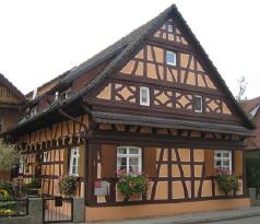 Hanauer Kniestockhaus Das Anderthalbstock-Haus wurde im Jahre 1811 von Johann Reif und Katharina Torwart erbaut und war ein Haus des bäuerlichen Mittelstandes. Die Giebelkonstruktion mit den kleinen Fenstern ist noch heute im Originalzustand erhalten. Die eingearbeitete Raute symbolisiert Fruchtbarkeit. Das Kniestockhaus ist im Hanauerland am meisten verbreitet. Die oberen Stockwerke dienten früher nur der Aufbewahrung von Vorräten. Ihr Ausbau erfolgte erst Anfang des 20. Jahrhunderts |