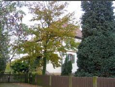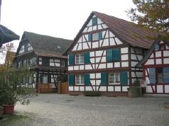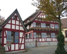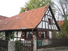 Einstöckiges Fachwerkhaus Dieses einstöckige Fachwerkhaus wurde im Jahre 1788 erbaut. Früher diente es als einfaches Haus für Tagelöhner und Hirten. Die Brezel zeigt den Beruf des Erbauers. Dieser Haustyp ist heute nur noch selten anzutreffen. |